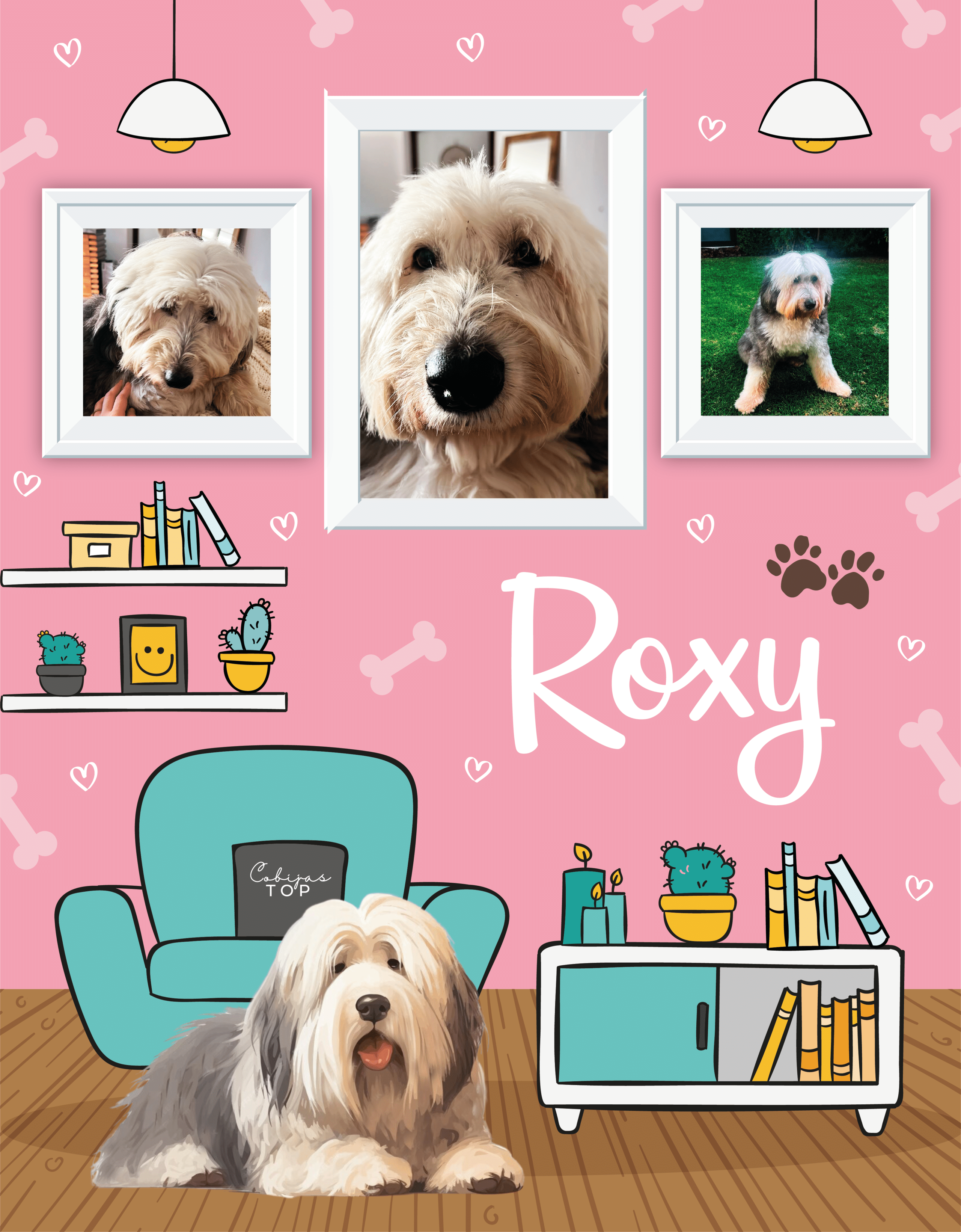• Diseño: Tus peludos serán los protagonistas; elige las fotos que más te gusten para el montaje más Top. Te regalamos el espacio para 3 fotos más ( tuyas o de tus familiares). Elige el color del fondo de tu Cobija en nuestra paleta de colores y escribe el nombre de tus peludos.