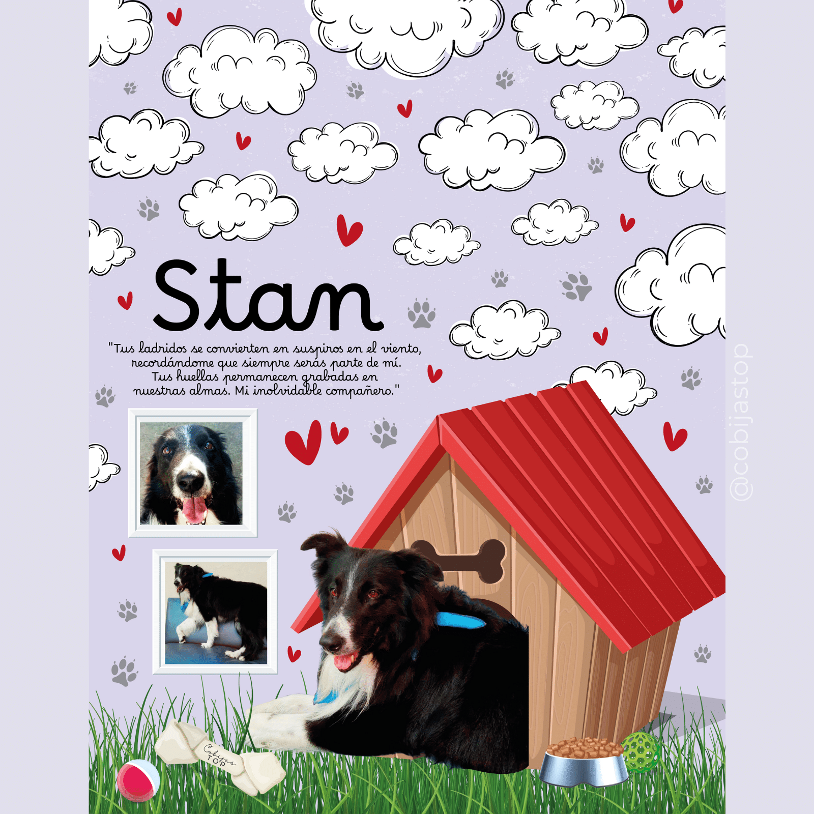 - Diseño: Elige la foto que más ames de tu peludito, escribe su nombre. (Diseño del fondo predeterminado)(Te regalamos el espacio de 2 fotos más para los cuadros del diseño.) (FOTOS EN CALIDAD HD)