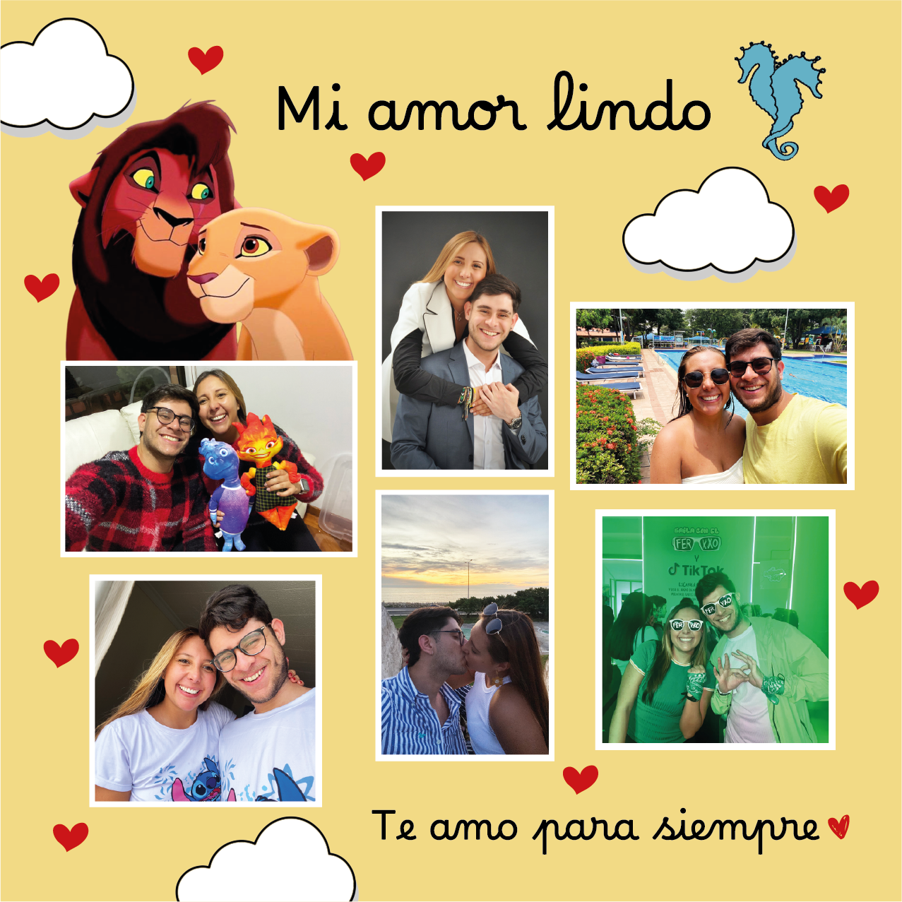 - Diseño: Recopila las (6) fotos que más te gusten de la persona, agregale una frase encantadora, escribe su nombre y elige el color del fondo en nuestra paleta de colores junto con tu personaje favorito de Disney.